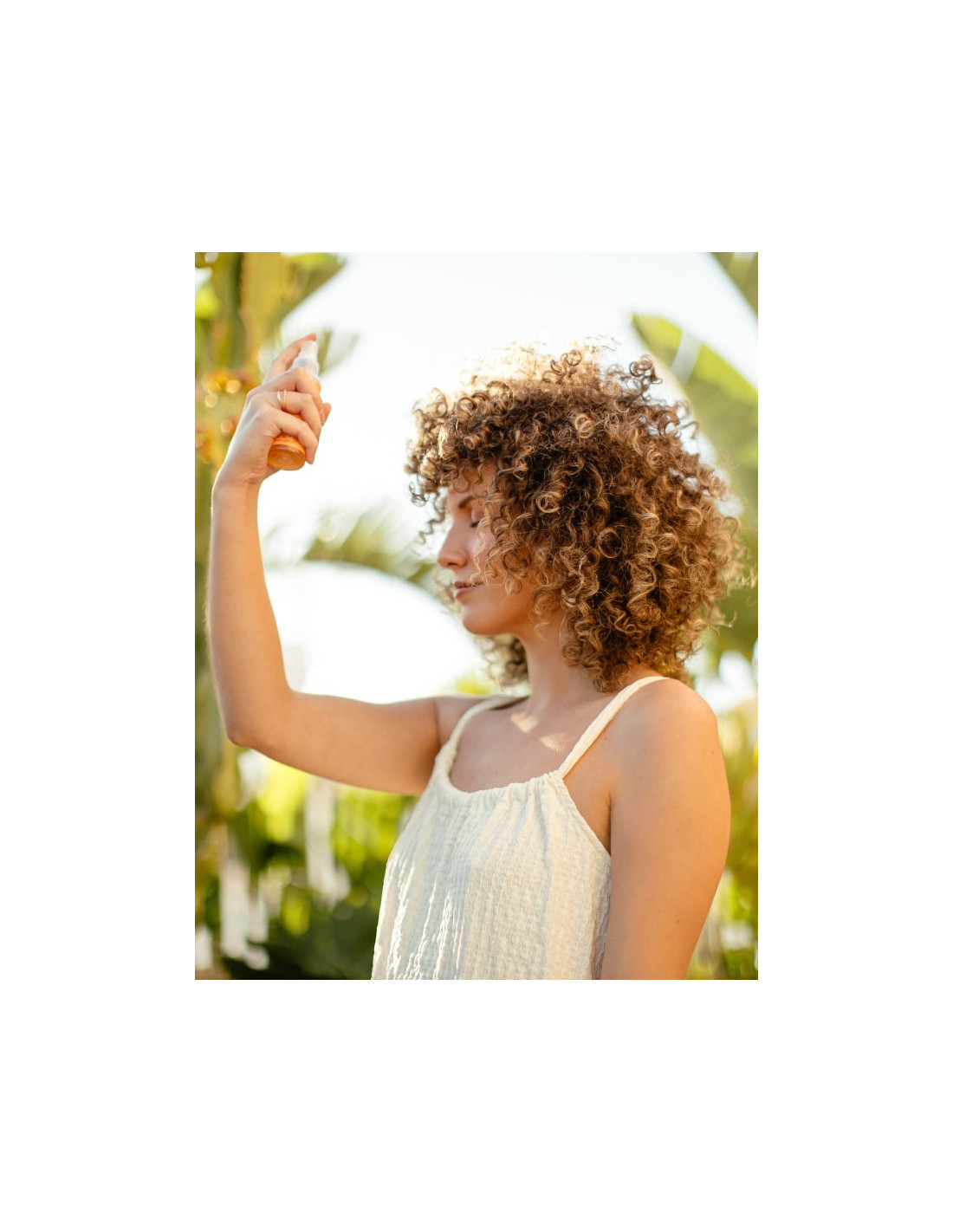 Gisèle Denis Hair Sunscreen protects hair from sun, salt and chlorine and serves as a thermal protector against hair dryers, flat irons and curling irons. It also moisturizes and seals the hair cuticle, preventing water loss to maintain natural moisture and shine. In addition, it restores damaged hair thanks to its high Urea content. Its vegan formula contains 93.8% ingredients of natural origin and is enriched with Jatropha Macrantha extract, a plant native to Peru rich in phytosterols, responsible for protecting hair from damage caused by UV radiation. It reduces hair protein degradation by 31.4%, repairing the cuticle and minimizing loss of shine and color. This spray protector improves hair resistance and elasticity, turning weak and brittle hair into stronger and more nourished hair.