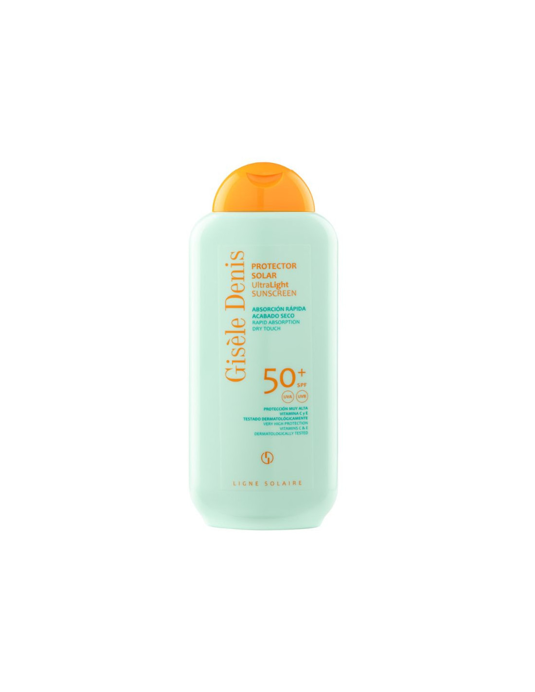 El Protector Solar UltraLight de Gisèle Denis está específicamente formulado para obtener una protección eficaz a la vez que proporciona una absorción inmediata y un acabado seco. Contiene filtros solares FPS 50+ (protección muy alta) para proporcionar una protección efectiva contra los efectos dañinos de los rayos UVA y UVB.