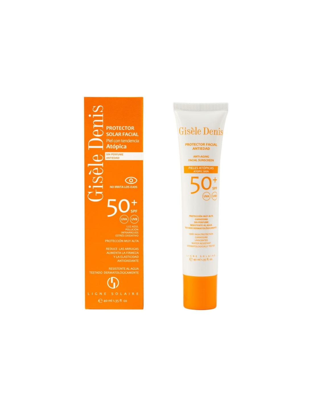 Gisèle Denis propõe este Protetor Solar Facial sem perfume, especificamente formulado para peles sensíveis e/ou com tendência atópica. É de largo espetro e possui um fator de proteção muito elevado (SPF 50+) para proporcionar uma proteção solar eficaz contra os efeitos nocivos dos raios UVA e UVB e dos factores ambientais. Contém Carnosina, um ingrediente ativo anti-radicais livres e anti-glicação que protege a pele dos efeitos nocivos da radiação UV e da luz azul. Após 8 semanas, este péptido biomimético alisa as rídulas e as rugas, aumenta a firmeza da pele em 17,8% e a elasticidade em 12,5%.
