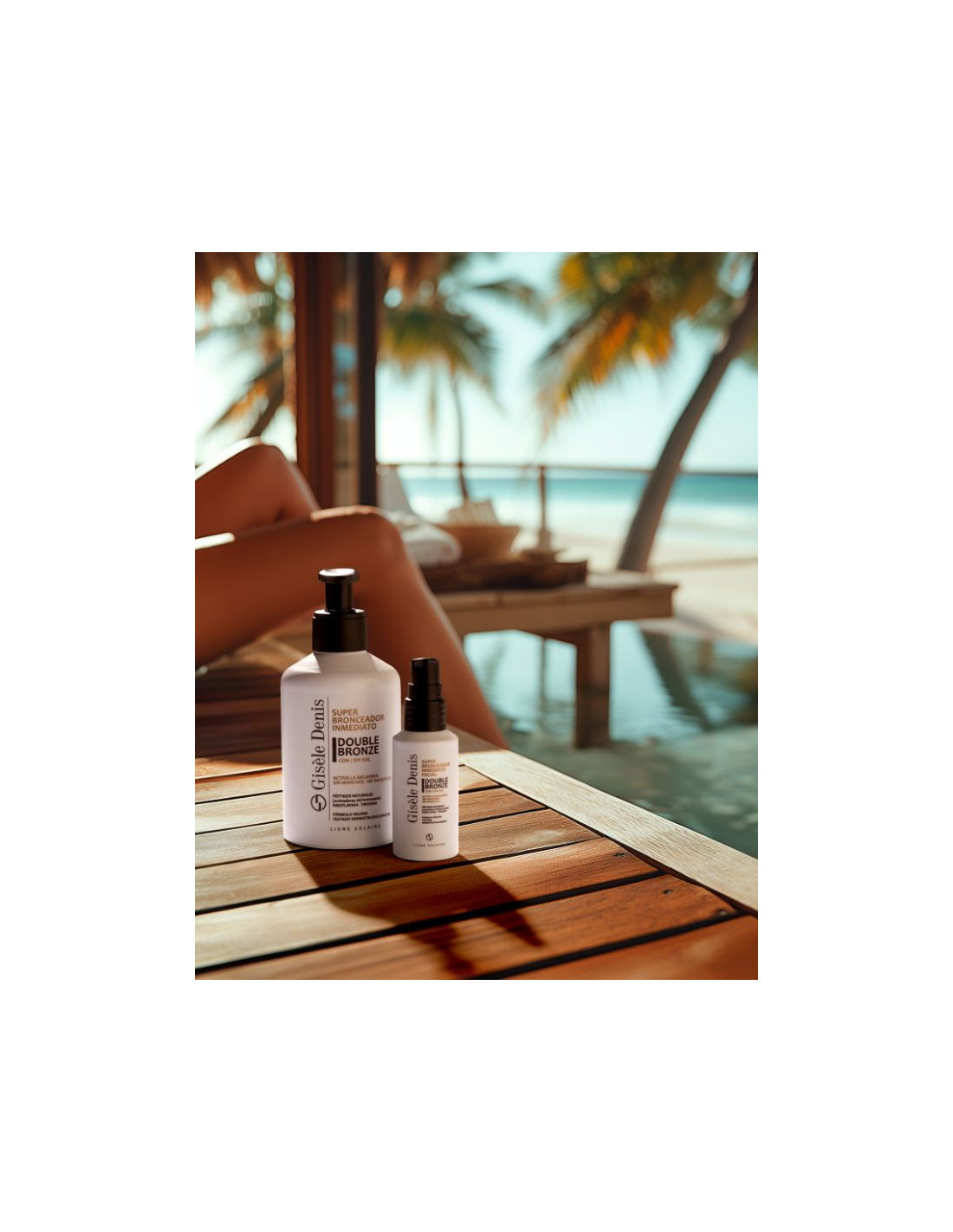Gisèle Denis Double Bronze Super Instant Body Tanner gera, acelera e potencia o bronzeado natural para um tom saudável e uniforme. A sua fórmula inovadora tem uma dupla ação na produção de melanina.